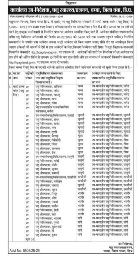 Deputy Director of Animal Health/Breeding District Chamba HP invited applications from desirous and eligible candidates for recruitment of 39 posts of Multi Task Worker (Pashu Mitra) in various veterinary institute. Interested candidates should apply before 05 February 2026.