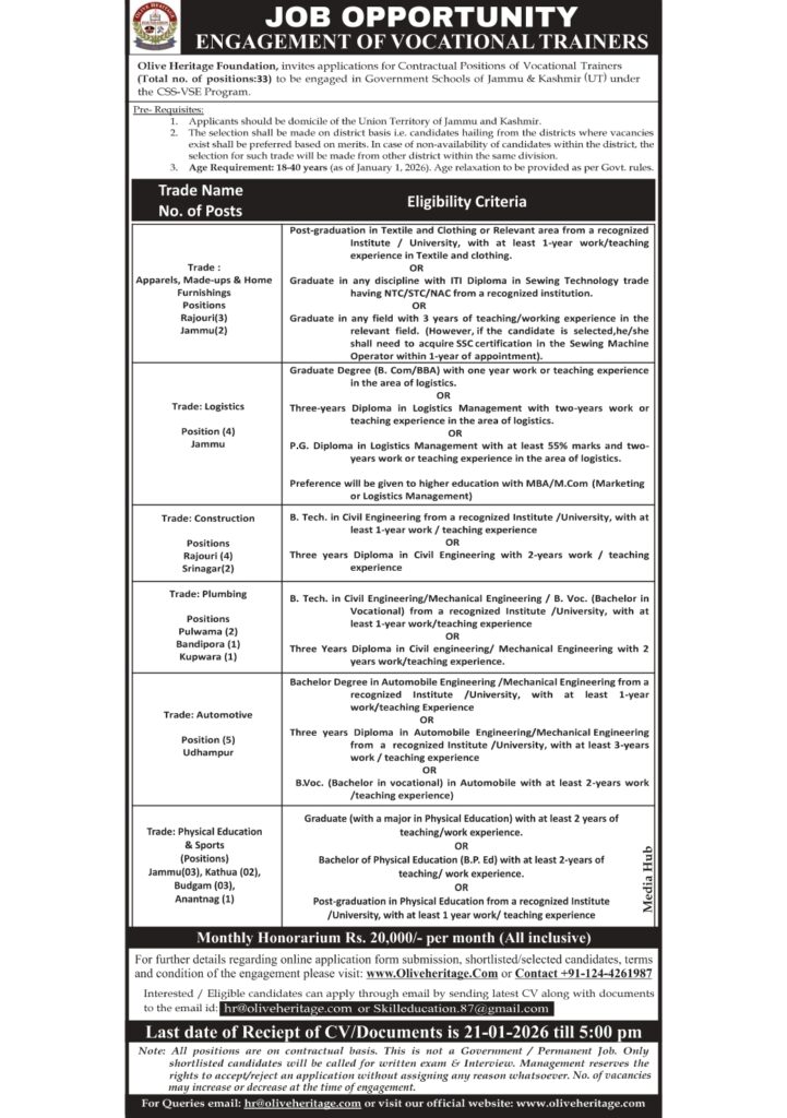 Olive Heritage Foundation invites applications for Contractual Positions of Vocational Trainers (Total no. of positions: 33) to be engaged in Government Schools of Jammu & Kashmir (UT) under the CSS Program.