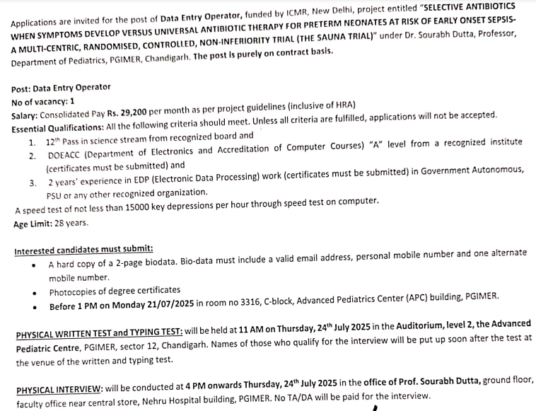 Applications are invited for the post of Data Entry Operator, funded by ICMR, New Delhi, project entitled “SELECTIVE ANTIBIOTICS WHEN SYMPTOMS DEVELOP VERSUS UNIVERSAL ANTIBIOTIC THERAPY FOR PRETERM NEONATES AT RISK OF EARLY ONSET SEPSIS-A MULTI-CENTRIC, RANDOMISED, CONTROLLED, NON-INFERIORITY TRIAL (THE SAUNA TRIAL)” under Dr. Sourabh Dutta, Professor, Department of Pediatrics, PGIMER, Chandigarh. The post is purely on contract basis.